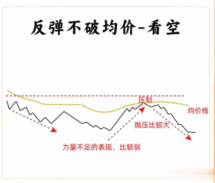 不才跌趋势中,股价偶尔也会出现反弹。但若是反弹至均价线隔壁时,屡屡受阻回落,无法灵验冲破,则评释均价线仍是由之前的撑持漂浮为弘大的压力。这反应了每一次反弹都碰到了弘大的抛压,多头力量不及,商场合座依然很弱。这种“反弹不破”的口头,平素是下降中继的信号,应逢高减仓。