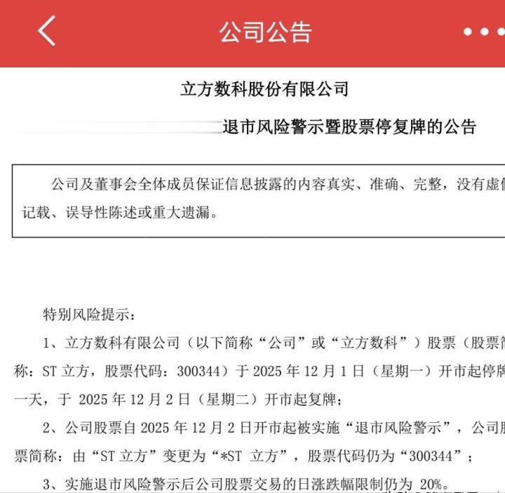 从12月2日起,*ST立方将被践诺退市风险警示。一朝最终裁定配置,股票将径直摘牌,转入三板商场。而三板是什么?日均成交可能不到10万块,股价跌到几毛钱齐没东说念主接——平淡散户基本等于“锁死本金”。