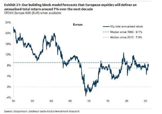 欧洲股市异日十年以欧元计年化呈文为7.1%,好意思元计为7.5%。盈利年复合增长4.6%,分成和回购计议3.5%,市盈率权衡小幅下跌,估值松开每年带来0.5个百分点负孝敬。