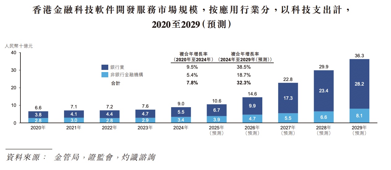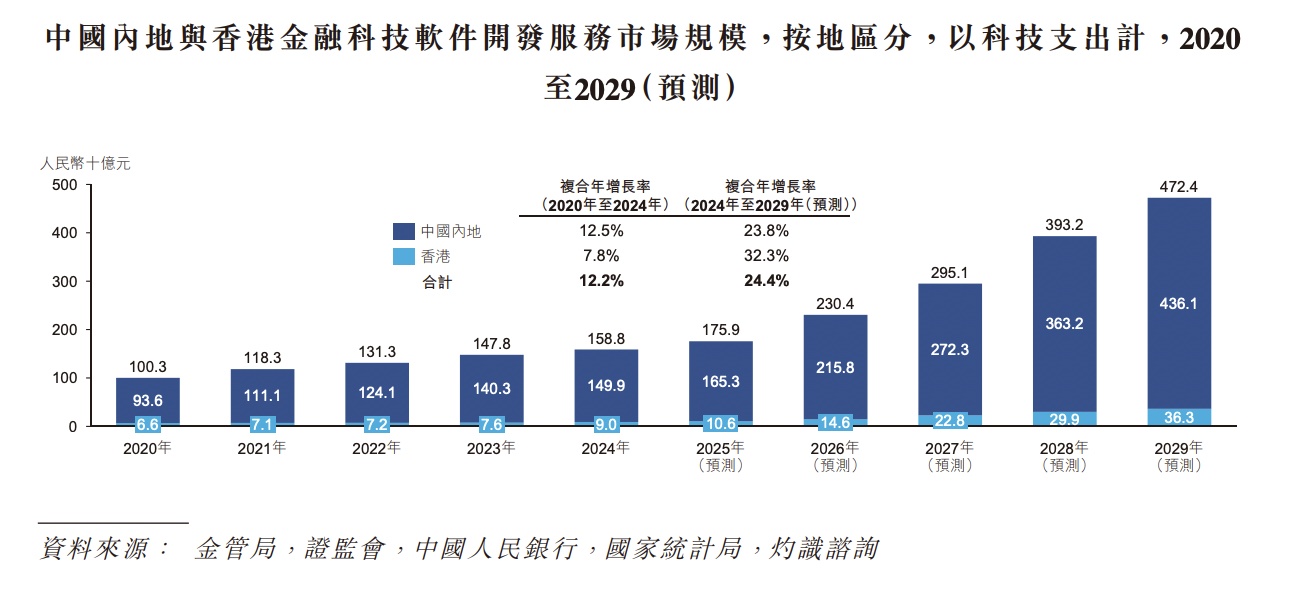 从行业来看,中国内地与香港金融科技软件建造办事的商场限制在昔日几年增长赶快,由2020年的1003亿元增长至2024年的1588亿元,时分复合年增长率为12.2%。伴跟着金融机构深刻数字化转型以及千般型金融机构加速布地点向改日的金融科技畛域,中国内地与香港金融科技软件建造办事商场将迎来高速发展,展望在2029年将增长至4724亿元,时分复合年增长率为24.4%。