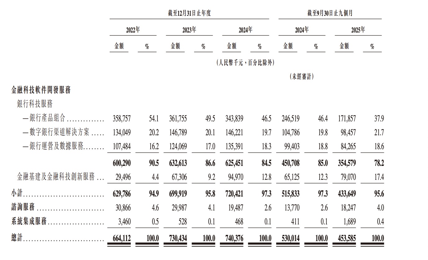 在金融科技软件建造办事里面,银行科技办事为最大组成部分,2024年收入达6.25亿元,占软件建造办事总数的84.5%。其中,银行居品组合孝敬最为隆起,2024年收入为3.43亿元,但占比从2022年的54.1%渐渐下跌至2025年首九个月的37.9%,响应公司在拓展数字银行渠说念处理决策与运营数据办事方面的战术侧重。数字银行渠说念处理决策收入由2022年的1.34亿元增至2024年的1.46亿元,占比踏委果约20%;银走运营及数据办事则从2022年的1.07亿元增长至2024年的1.35亿元,占比升迁至18.3%,体现出金融机构对数据分析与智能决策才调需求的继续高潮。