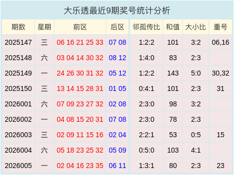 后分辨析:上期后区开出号码06、11,属于偶奇数号码,本期量度开零散偶数后区号码:05、12。