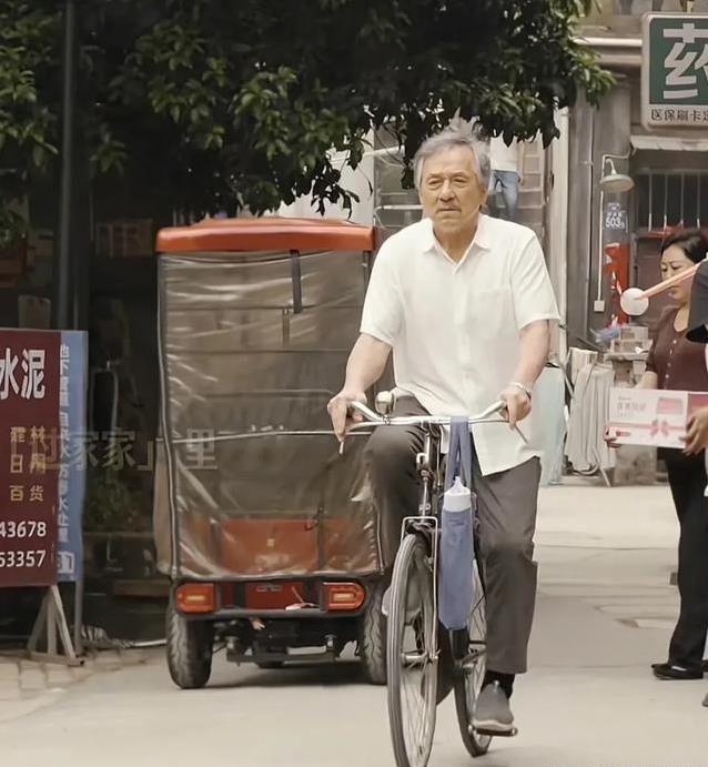 成龙骑着自行车迟缓出刻下画面里,白头发在风中晃荡,好多东说念主第一眼齐没认出来这是他。