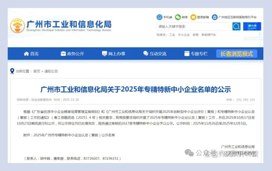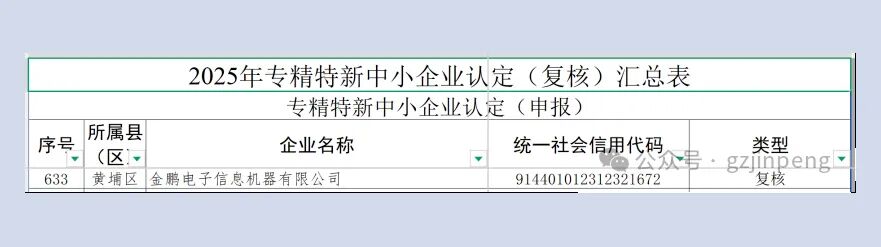 近日,广州市工业和信息化局公示了2025年专精特新中小企业认定(复核)通过企业名单。经由巨匠严格评审和详细评估,金鹏电子信息机器有限公司胜仗通过2025年度复核,再度荣获广东省“专精特新”中小企业认定。