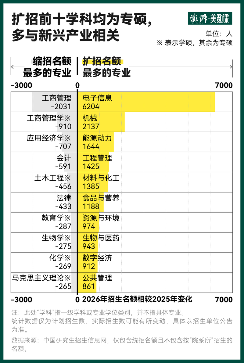 彭湃好意思数课基于教养部高校学生司创立的中国商议生招生信息网公布的硕士专科目次,梳理了2025年、2026年两届商议生招生活划目次中二十余万条招生信息,发现本年统招限额的扩大主要在专硕上,其中,工学类专硕限额增幅朝上一万三千东说念主,占据近三分之二的扩招限额。