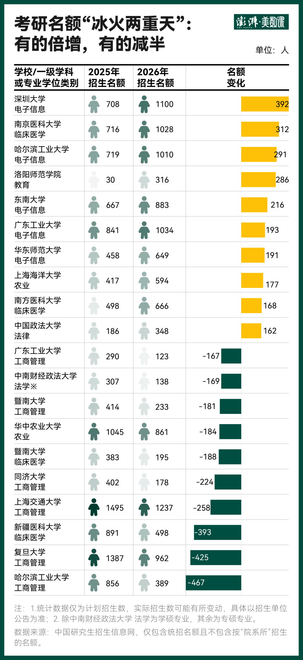 数据清晰,招生限额的变动在不同招生花样间差别较大。深圳大学电子信息专科本年比前年扩招392东说念主,而哈尔滨工业大学的工商科罚专科缩招超50%。据《中国新闻周刊》报说念,部分高校招生限额的“缩水”,让一些备考已久的考生不得不磋商转变考研策动。