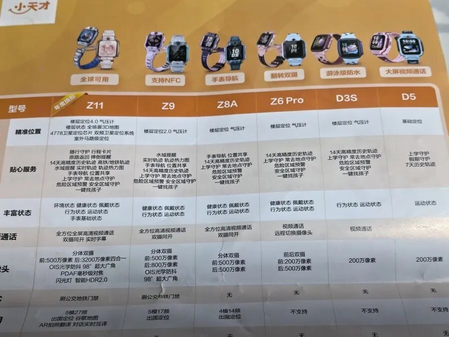 小天才门店内的宣传页,不同型号的腕表性能不同,功能不同。