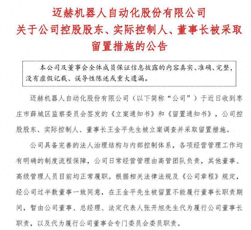 11月16日,迈赫股份(301199)发布公告,公司控股鞭策、本体边界东谈主、董事长王金平被立案探望并继承容置要领。